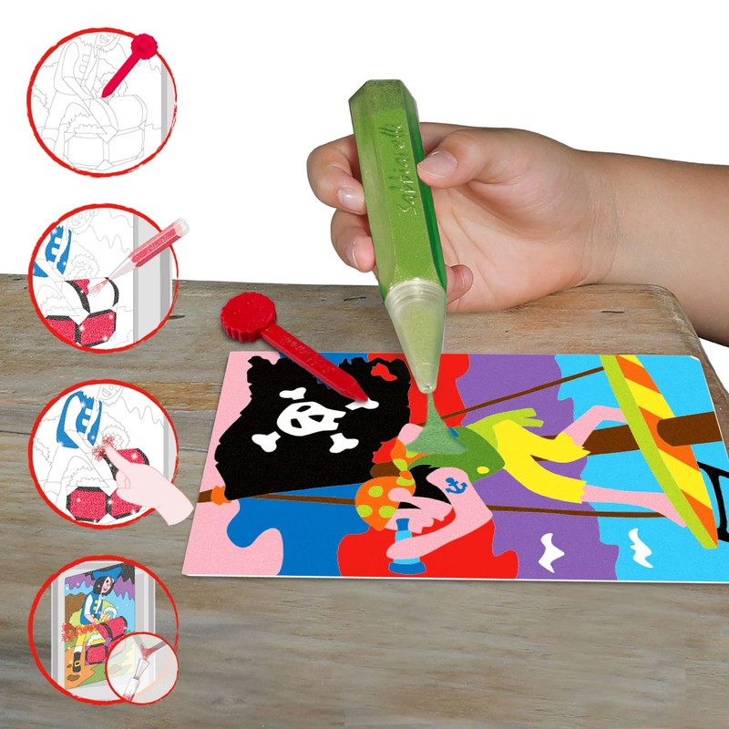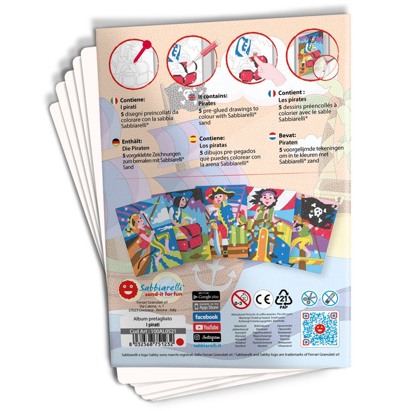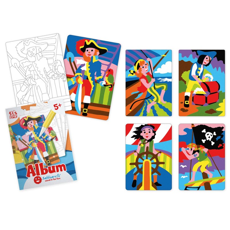 - Product: album Sabbiarelli with 5 different drawings of the world of pirates, to paint with sand. 100% Made in Italy