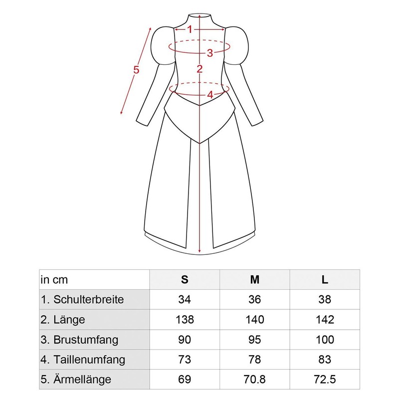 Size S: Dress length: 138 cm, shoulder width: 34 cm, chest circumference: 90 cm, waist circumference: 73 cm, sleeve length: 69 cm.