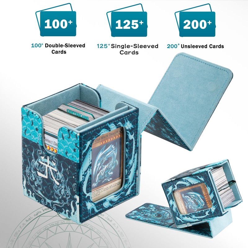 • Large Capacity: With its spacious design, our Card Deck Box can hold over 220 unsleeved cards, 120 single-sleeved cards, or 100 double-sleeved cards. Deck box provides plenty of room to keep your cards safe and easily accessible.
