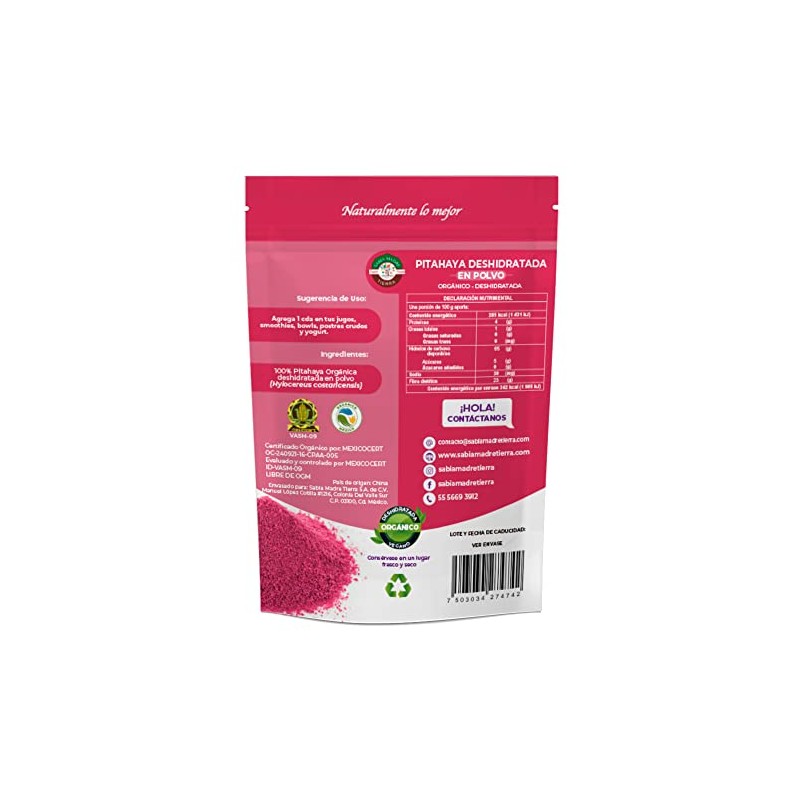 - ORIGEN: 100% Pitahaya Orgánica, 100% Natural, Libre de gluten, soya, sin aditivos, sin gomas, sin saborizantes ni colorantes