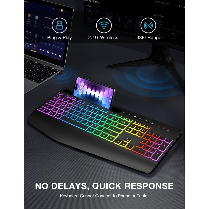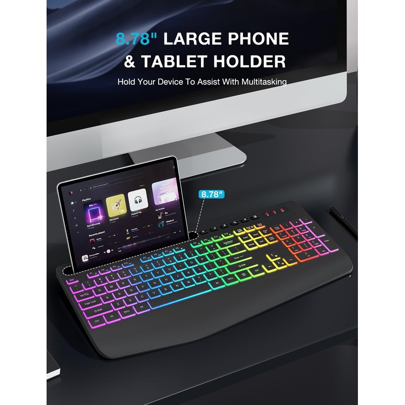 Wireless Keyboard with 8 Colored, 9 Effects Backlits, Wrist Rest, Phone Holder, Rechargeable Ergonomic Computer Keyboard with Silent Keys, 2.4G Lag-Free Cordless Set for PC, Laptop, Windows, MacBook