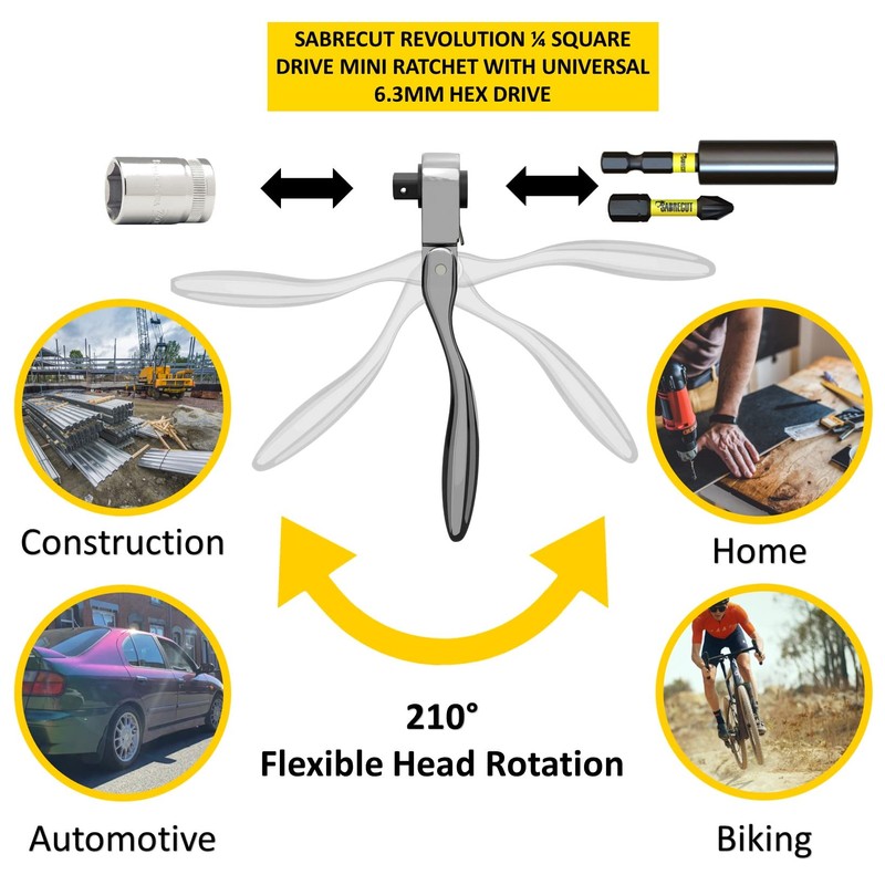 - 1 piece SabreCut Revolution Flexible Head 6.3mm (1/4") HEX & 1/4" Square Drive Micro Ratchet
