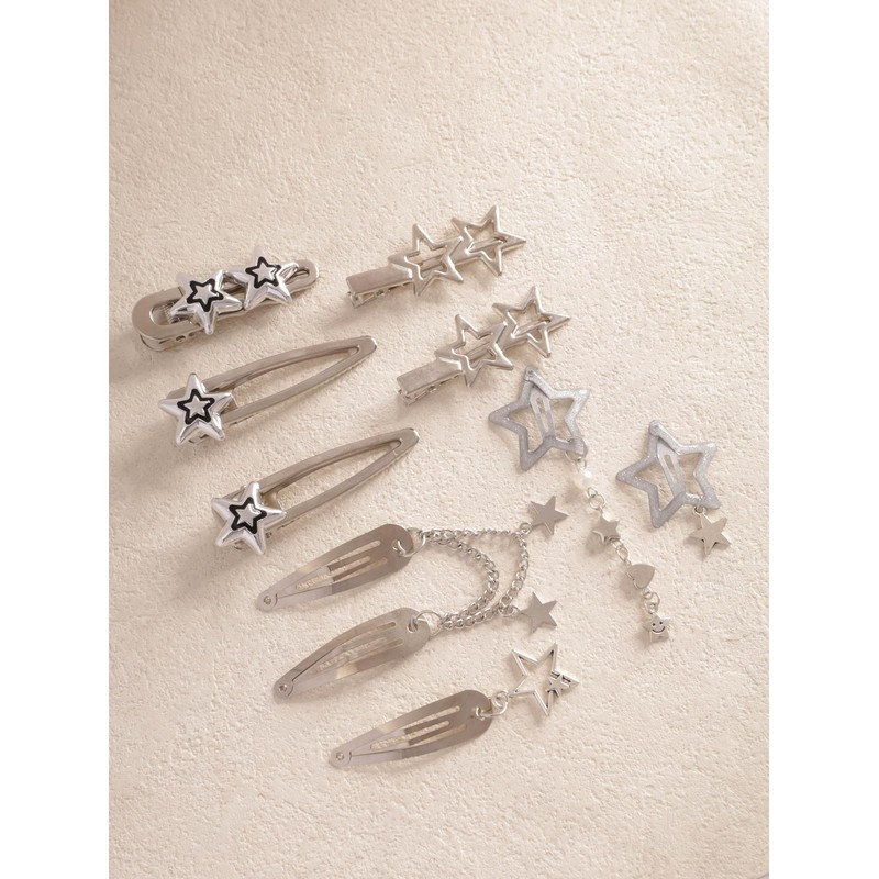 - Trendy Emo Grunge Punk Goth Y2K Star Hair Clips (8pcs Pack) – This package includes 8 unique silver-tone star hair clips in different styles, giving you endless mix-and-match options to create bold and playful hairstyles. Designed for lovers of goth, emo, punk, grunge, and Y2K fashion, these star-shaped hair clips add a touch of sparkle and edge to any hairstyle. Perfect for those who love alternative fashion