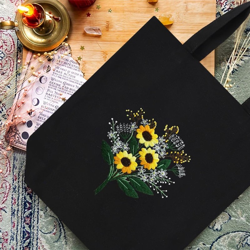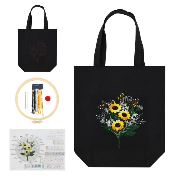 SacJkt Embroidery Set Adults, Embroidery Kit, Canvas Tote Bag Embroidery Starter Set with Tool and Instructions, Cross Stitch Kit for Beginners Adults and Embroidery Lovers (Black)