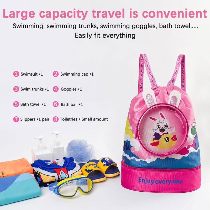 - DRY-WET SEPARATION DESIGN: You can put wet and dry clothes in different compartment after swimming.The bottom of drawstring bags for children with a separate compartment, an ideal place to store shoes.