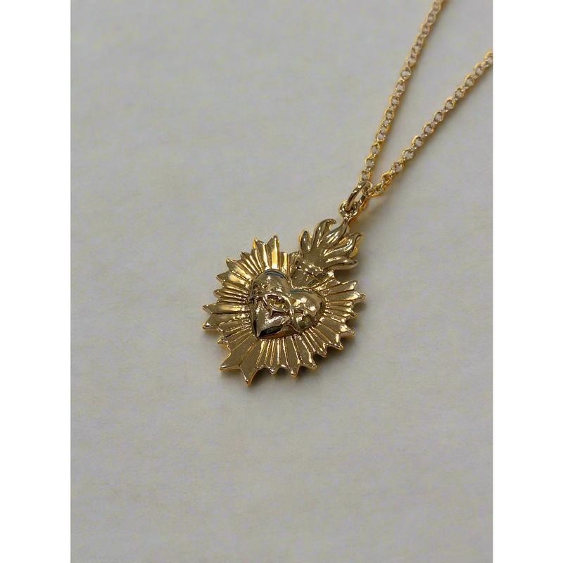 Embrace your faith and express your devotion with this stunning Sacred Heart of Jesus Necklace. The intricately detailed Sacred Heart medallion, crafted in polished yellow bronze, features a radiant design with flames atop the heart, symbolizing Christ's divine love. This beautiful pendant hangs gracefully from a gold-filled chain, ensuring lasting beauty and durability. Wear this necklace as a reminder of God's boundless love or gift it to a loved one seeking spiritual inspiration.