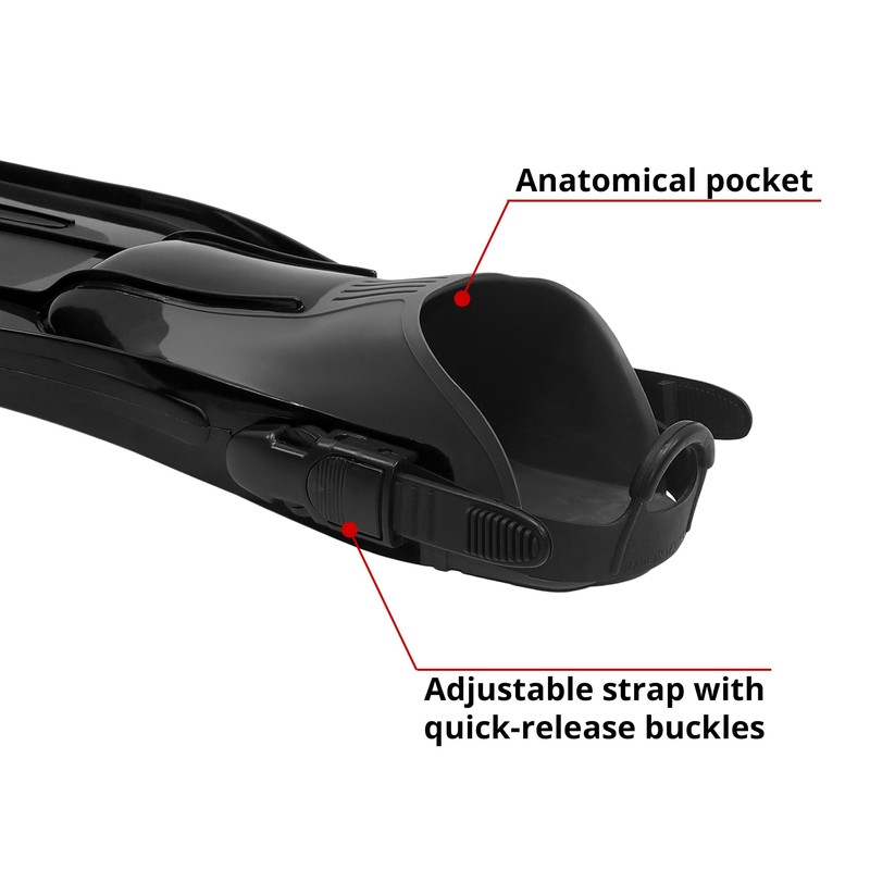 - QUICK-RELEASE: The straps are not only adjustable, but they also come with a quick-release swivel buckle that allows you to take off the fins easily after your dive.