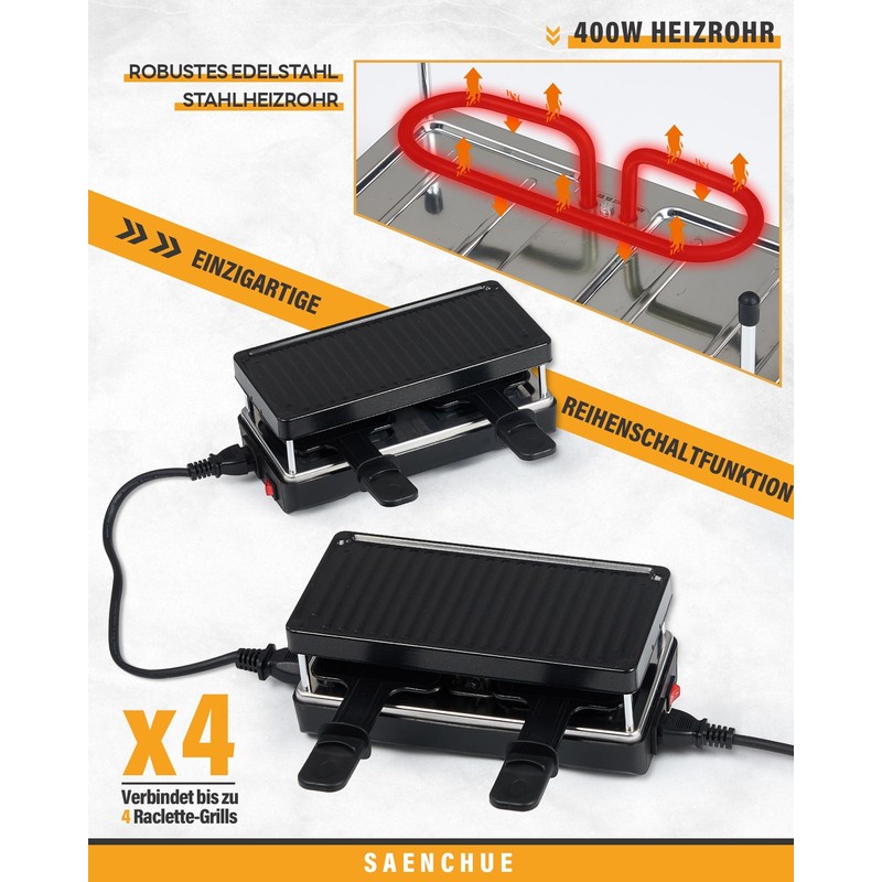 - Durable and Expandable Design: Crafted with quality materials including a stainless iron lower baking pan, black plastic bottom shell, and supported by four pillars, our raclette grill is built to last. Additionally, it features a unique series connection function, allowing you to connect up to four of the same model raclette grills for larger gatherings or expanded culinary offerings.