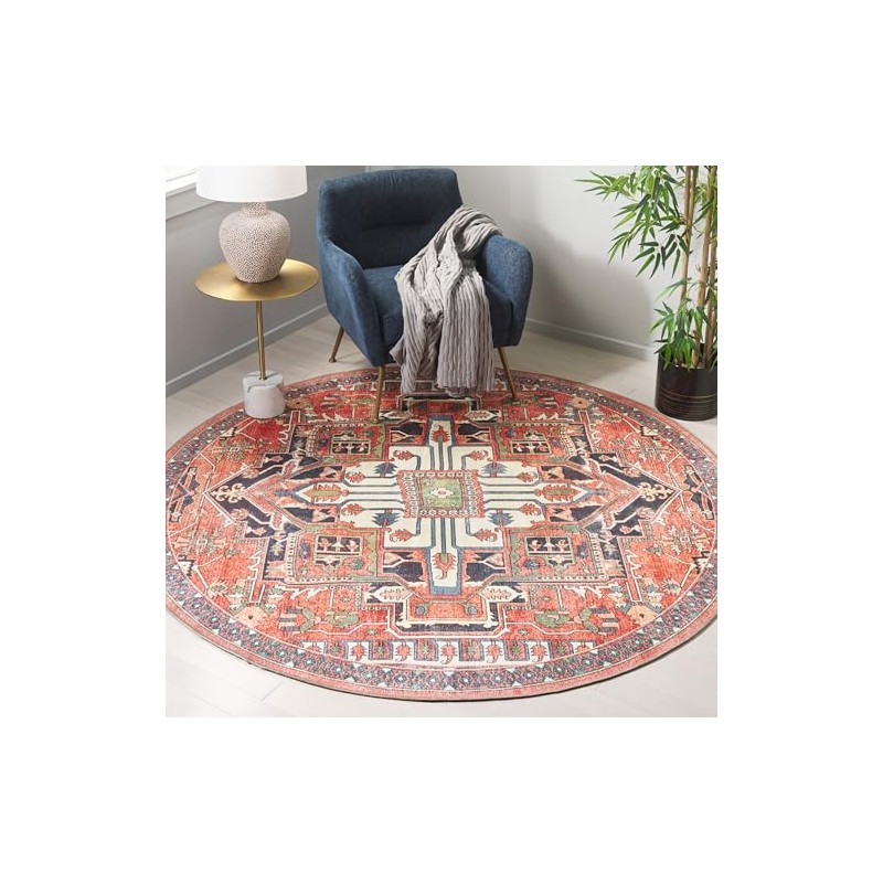 SAFAVIEH Serapi Collection Area Rug - 6'7" Round, Rust & Navy, Persian Design, Machine Washable & Slip Resistant, Ideal for High Traffic Areas in Living Room, Bedroom, Dining (SEP812P-7R)