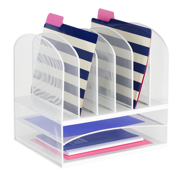- EFFICIENT ORGANIZATION. Six 2" wide sections make easy work of desktop clutter by displaying important files and binders vertically for quick selection. Two horizontal trays conveniently hold mail, stacks of paper, catalogs, folders, and envelopes.