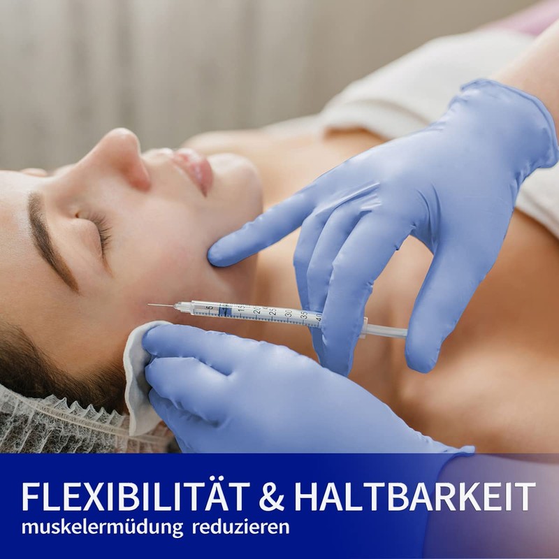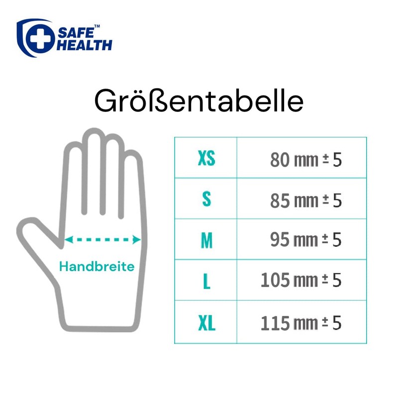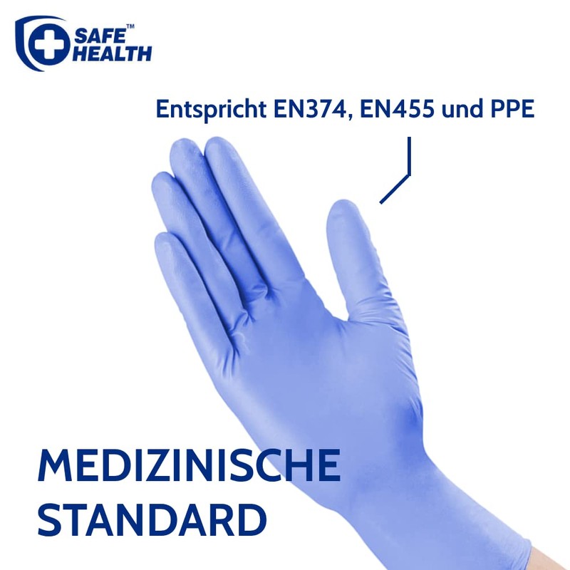 - Bessere Berührungsempfindlichkeit: SafeHealth Nitrilhandschuhe sind widerstandsfähiger gegen Durchstiche als andere. Die Oberfläche der Fingerspitzen ist strukturiert, was angenehm ist, um Dinge zu greifen. Dank der Perlmanschette ist es einfach an- und auszuziehen.