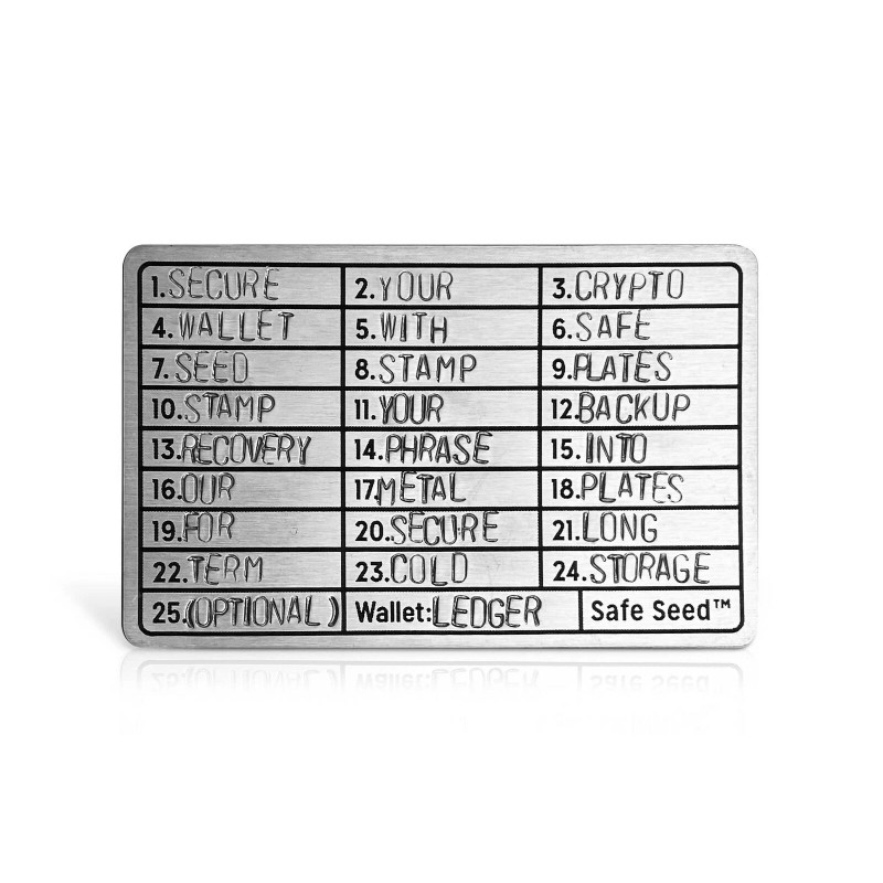 Safe Seed Complete Stamp Kit. Safe Seed is a simple and straightforward way to secure your BIP39 crypto assets. Precision laser engraved heavy duty Stainless Steel plates will withstand just about anything along with a melting point of 2550F (over double the average house fire) you can be sure your seed phrase is safe. Just stamp it out with your 12-25 word recovery phrase and secure it in a safe place. For added security you can stamp half of your phrase on one plate, half on another plate and keep them in separate locations. Check out our other listings for additional metal options (Titanium, Molybdenum, Copper, Silver Plates, 5oz Silver Bars), Full Stamp Kits, and other accessories.