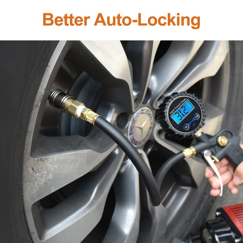 • ๐‹๐Ž๐‚๐Š๐ˆ๐๐† ๐€๐ˆ๐‘ ๐‚๐‡๐”๐‚๐Š ๐„๐€๐’๐˜ ๐“๐Ž ๐”๐’๐„: Pushed forward the sleeve to lock the valve stem and pulled back the sleeve to release the lock on air chuck, it keep your hands free while the tire is inflating or deflating. The featured lock-on sleeve is much easier and faster than other chucks, ensure it fix onto the valve stem.