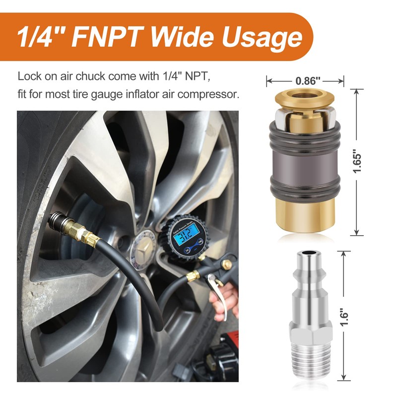 • ๐–๐ˆ๐ƒ๐„๐‹๐˜ ๐€๐๐๐‹๐ˆ๐‚๐€๐“๐ˆ๐Ž๐: The top thread is 1/4 inch FNPT for compatibility w/ tire inflators & gauges to control air flow from compressor w/ precision for tire inflation (not recommended to attach directly to air compressor hose).Maximum pressure: 150 PSI