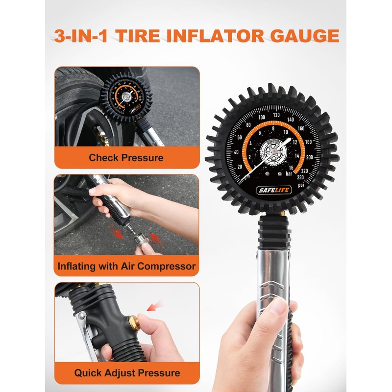SAFELIFE Tire Pressure Gauge, Heavy Duty Tire Inflator Gauge 230PSI