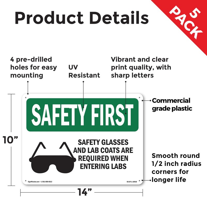 Safety Glasses And Lab Coats With Symbol OSHA SAFETY FIRST Rigid Plastic Sign 14 Inch x 10 Inch - 5 Pack