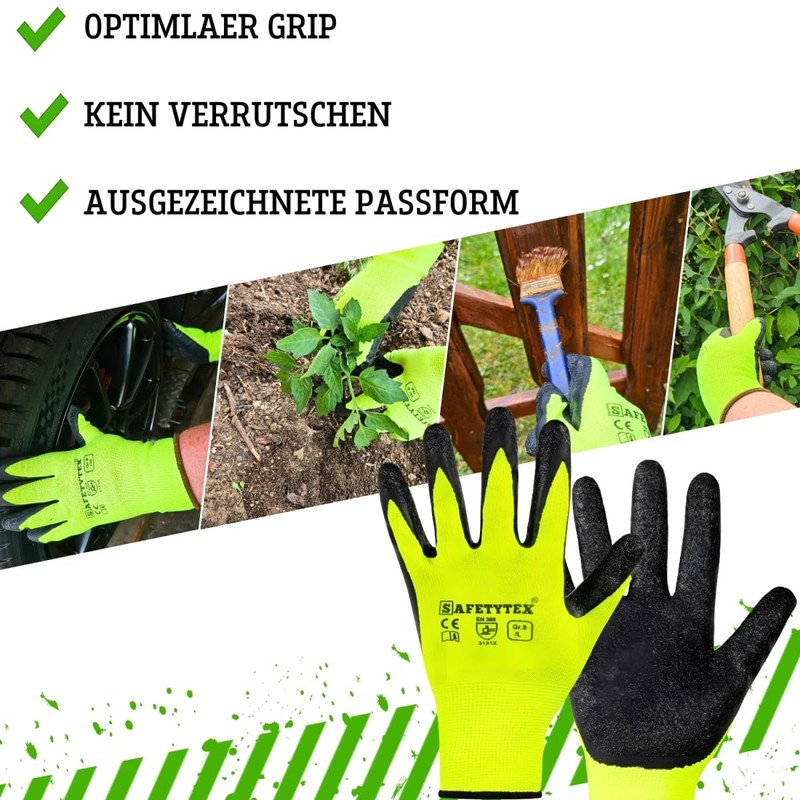 Safetytex Pack of 36 Work Gloves, Assembly Gloves with Latex Coating, Neon Yellow Gloves, Protective Gloves for Home, Garden, Industry and Crafts, Size 8