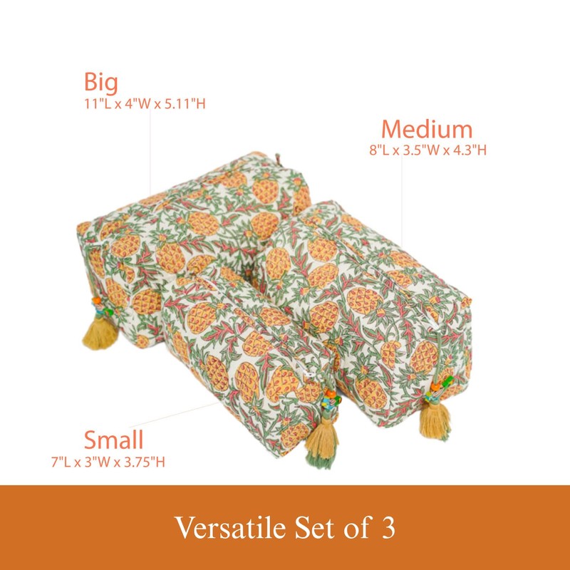 The set includes three sizes to accommodate all your needs: a large makeup bag (11"L x 4"W x 5.11"H), a medium makeup bag (8"L x 3.5"W x 4.3"H), and a small makeup bag (7"L x 3"W x 3.75"H). Perfect for organizing everything from your trusty compact mirror to your favorite hairbrush, these makeup bags are ideal for travel or daily use. The whimsical handsewn tassel attached to each zipper pull adds a charming touch, crafted by the same artisan who creates our decorative tassels for our block printed tote bags.