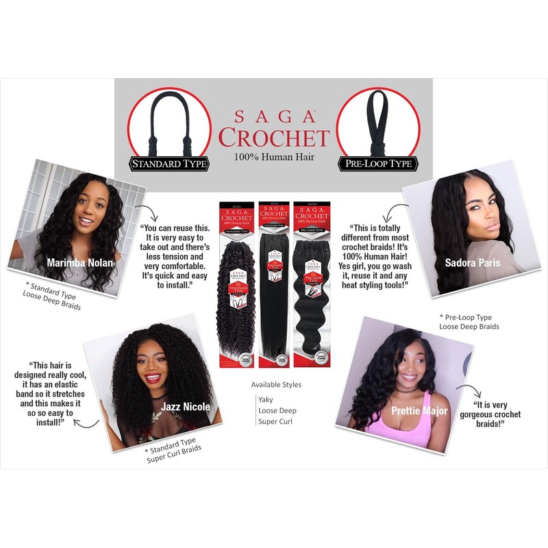 **Saga Human Hair Crochet Braids Standard Type Super Curl** Break Free of 100% Human Hair Extensions As You Know It And Step Into The Future of Human Hair With Brand New Concept, SAGAⓇ CROCHET 100% HUMAN HAIR. Experience SAGAⓇ CROCHET Human Hair With The Benefits of Crochet. **HAIR CARE INSTRUCTION** Make sure your hair is washed & deep conditioned prior to installation **SCALP CLEANSING TREATMENT:** Part hair in sections then use leave in spray shampoo and massage entire scalp to release dirt and/or product build-up. After rinsing the scalp, spray a mixture of water and essential oils to restore moisture. **WASHING:** -Before washing hair, brush out all tangles starting from the bottom and work up to the top. -For curly hair: Do not brush. Finger comb to remove all tangles. -Wash the hair with sulfate free shampoo in lukewarm water. Never use hot water. -Apply conditioner: Allow it to absorb for couple of minutes then rinse thoroughly. -Gently pat out excess water with a clean towel. Do not rub and Air dry.
