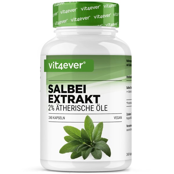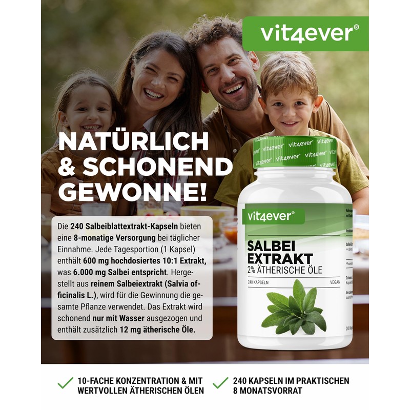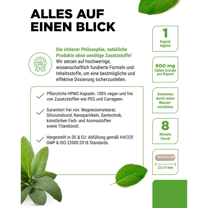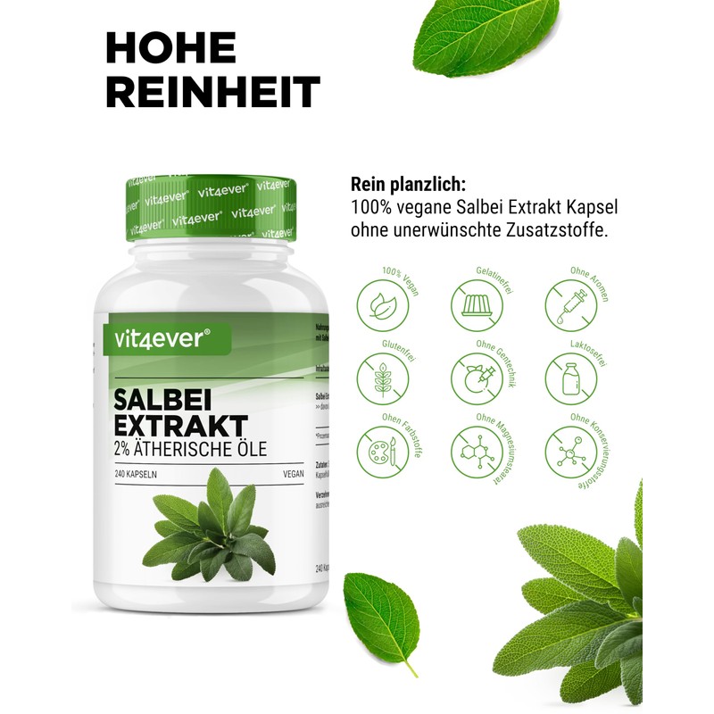 - High dose 7 month supply: the 240 sage leaf extract capsules offer a supply for 7 months with daily intake. Each capsule contains 600 mg of high-dose 10:1 extract, which is equivalent to 6,000 mg sage leaves.