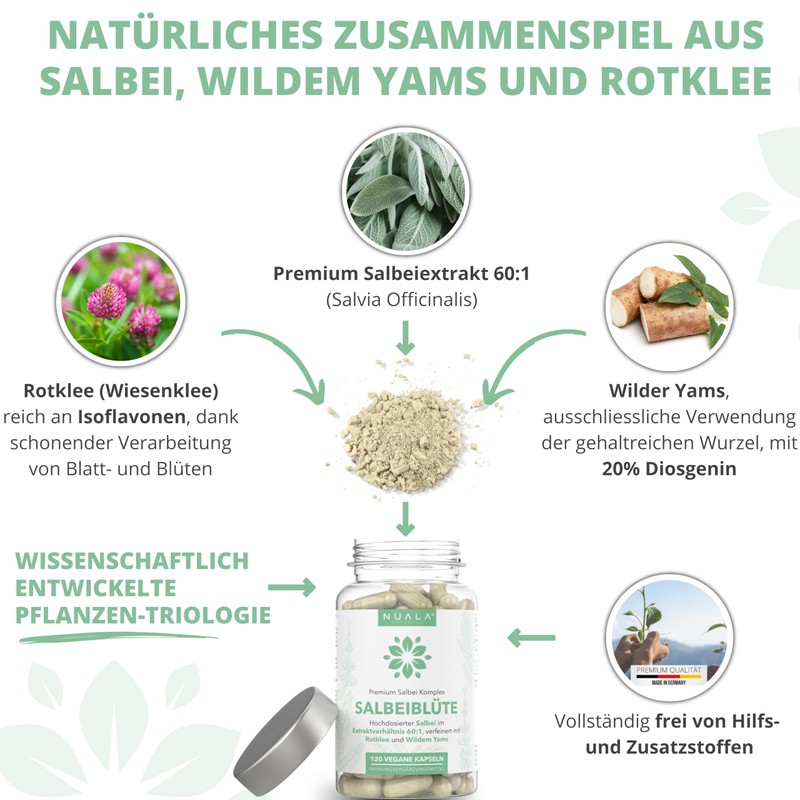 - What ingredients are used? We use high quality ingredients including sage, known for its rosemary acid, red clover, rich in isoflavones, and wild yams rich in diosgenin. These botanicals work together to relieve the "heat of everyday life".
