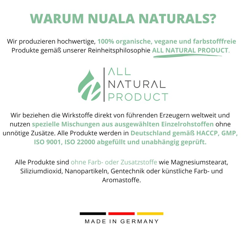 - What is all natural product? Our philosophy is to produce 100% organic, vegan and dye-free products of the highest quality. We source our active ingredients directly from leading producers worldwide and use special blends of selected raw materials, without unnecessary additives. All products are bottled and tested in Germany according to the standards HACCP, GMP, ISO 9001, ISO 22000.