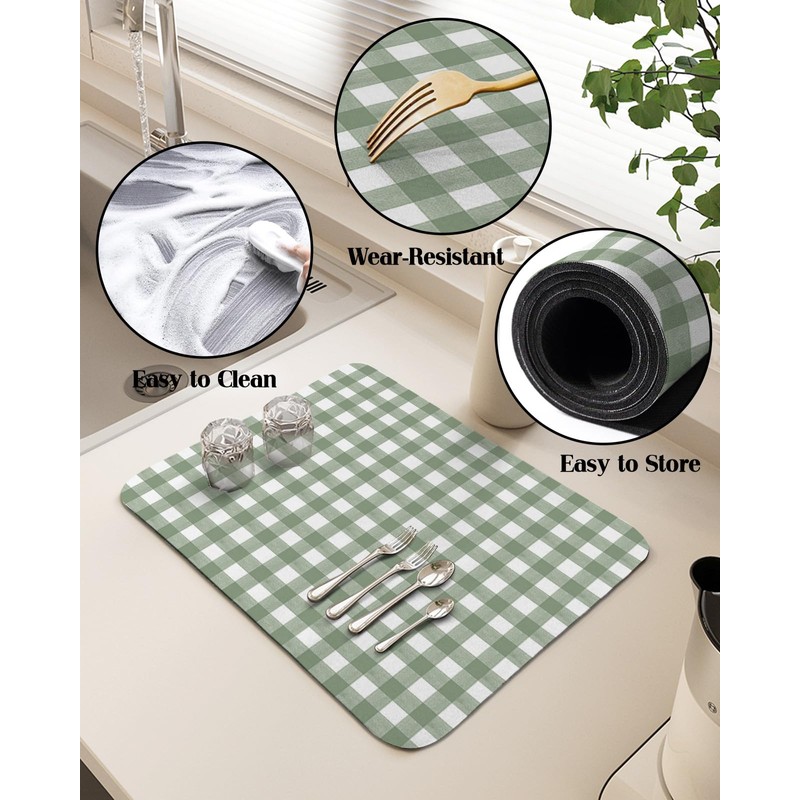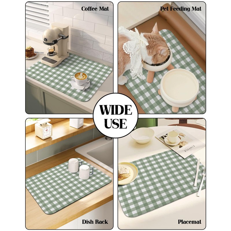 - Widely Used: Sage green plaid dish drying mats is your kitchen/sink/bathroom drainage board and often an extra work surface as well. Place a dish drying mats for kitchen counter next to the sink, not only for drying dishes and pans, but also for holding fresh vegetables and fruit after washing. Dishes drying mat are also great for pets, the soft fabric makes them a great bed for dogs and absorbs food spills from your pet's meal. Recommended for anyone with wet countertop/floor issues!