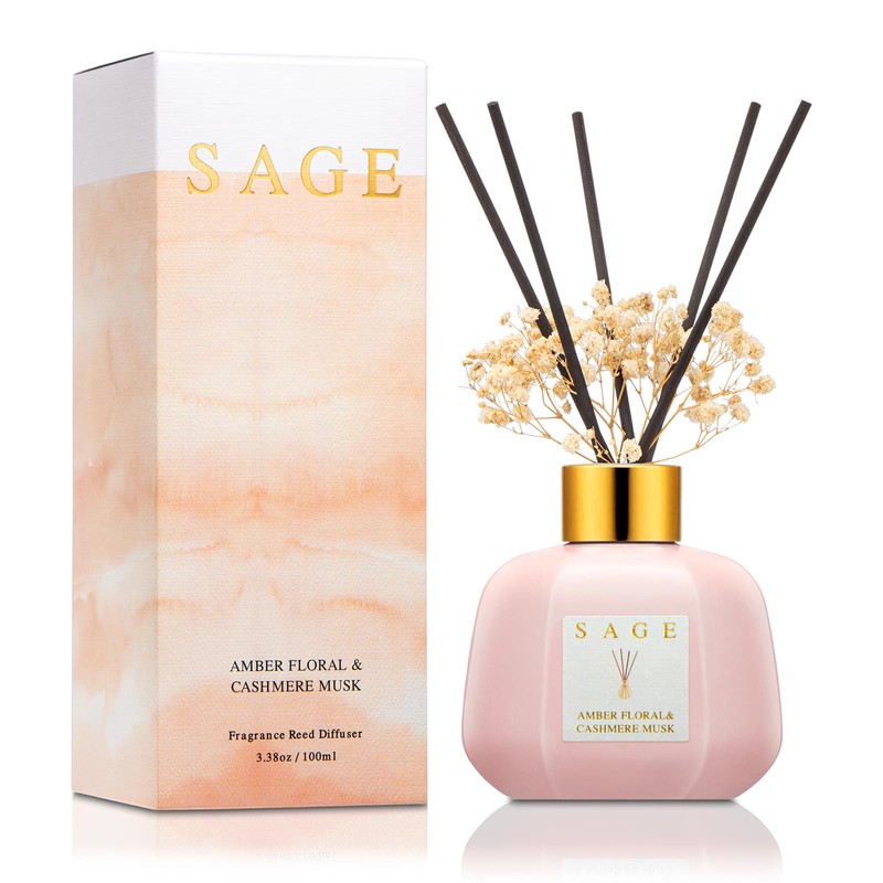 SAGE Hotel Reed Diffuser - 3.4oz Amber Cashmere Scent Diffusers for Home | Preserved Real Flower & Oil Diffuser Sticks | Inspired by Shangri-La Room Scent | Nightstand or Bathroom Decor for Shelves