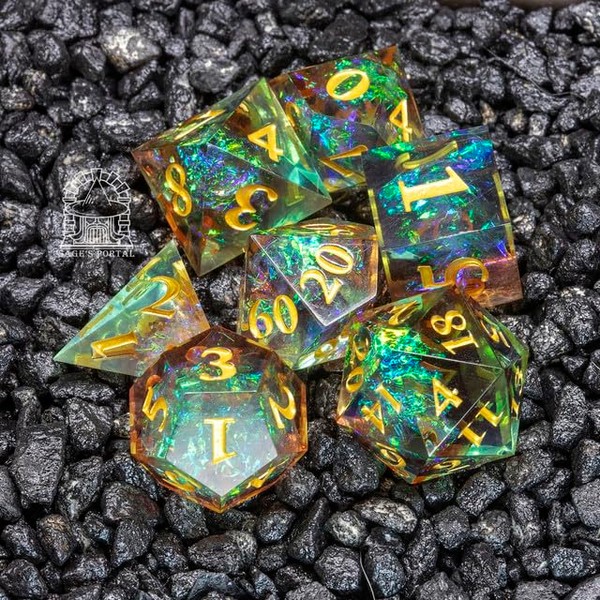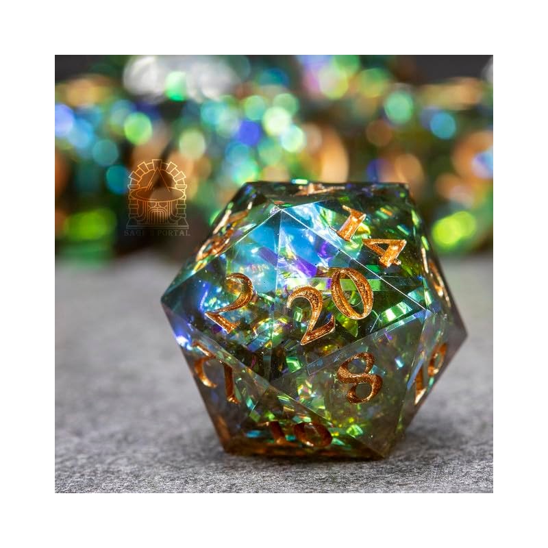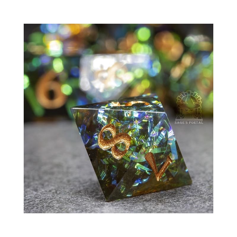 • Sharp Edge Resin: Rejoice with these amazing sharp edged dice. This exquisite sharp edge resin 7-dice set features transparent resin with holo streamers design. This set features green tones with holo streamers and copper numbers