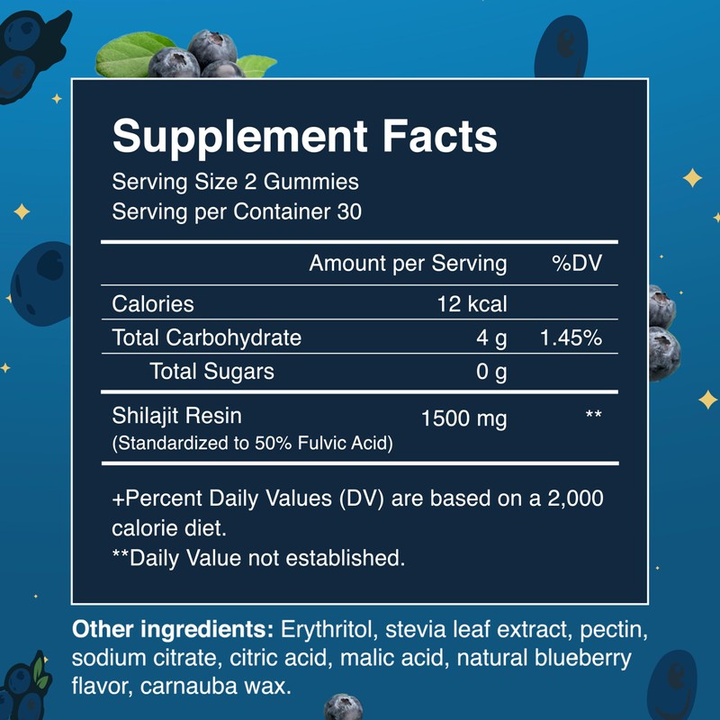 - 1500 mg of Authentic Shilajit Resin: Each 2-gummy serving delivers a standardized 1500 mg dose of pure shilajit resin, carefully extracted and concentrated to 50% fulvic acid. Shilajit is a time-honored adaptogenic substance traditionally valued for its revitalizing properties and its role in supporting foundational wellness.