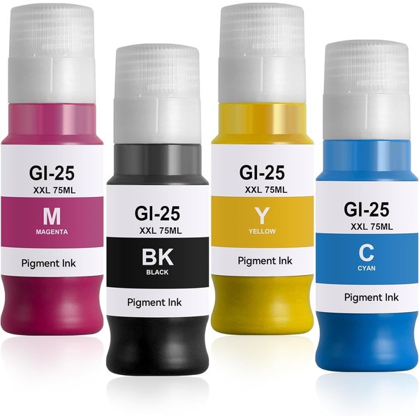 - Package includes: 1x Black GI-25 ink,1x Magenta GI-25 ink,1x Cyan GI-25 ink,1x Yellow GI-25 ink