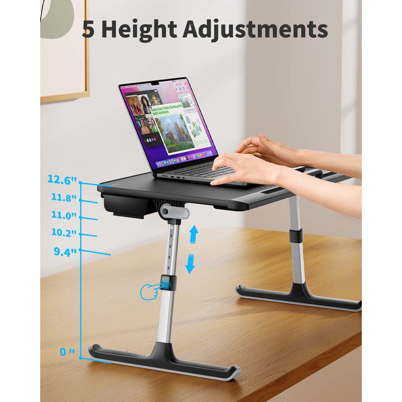 - [Easy To Use] Fully assembled adjustable laptop bed table: two auto-lock buttons on each side easily enable quick changes in height, legs can be set to 5 different heights adjustable from 9.4"-12.6"
