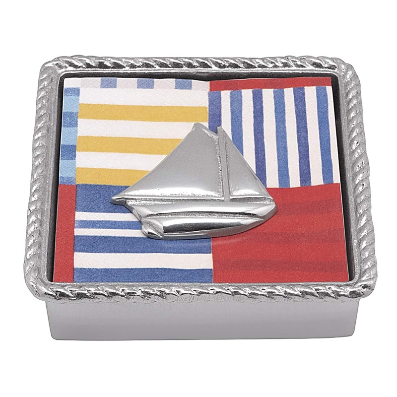 Throw off the lines and set sail to a destination all your own. Part of the High Seas collection, the Twist Napkin Box borders primary-color sailboat cocktail napkins which are topped off with a recycled aluminum sailboat napkin weight.