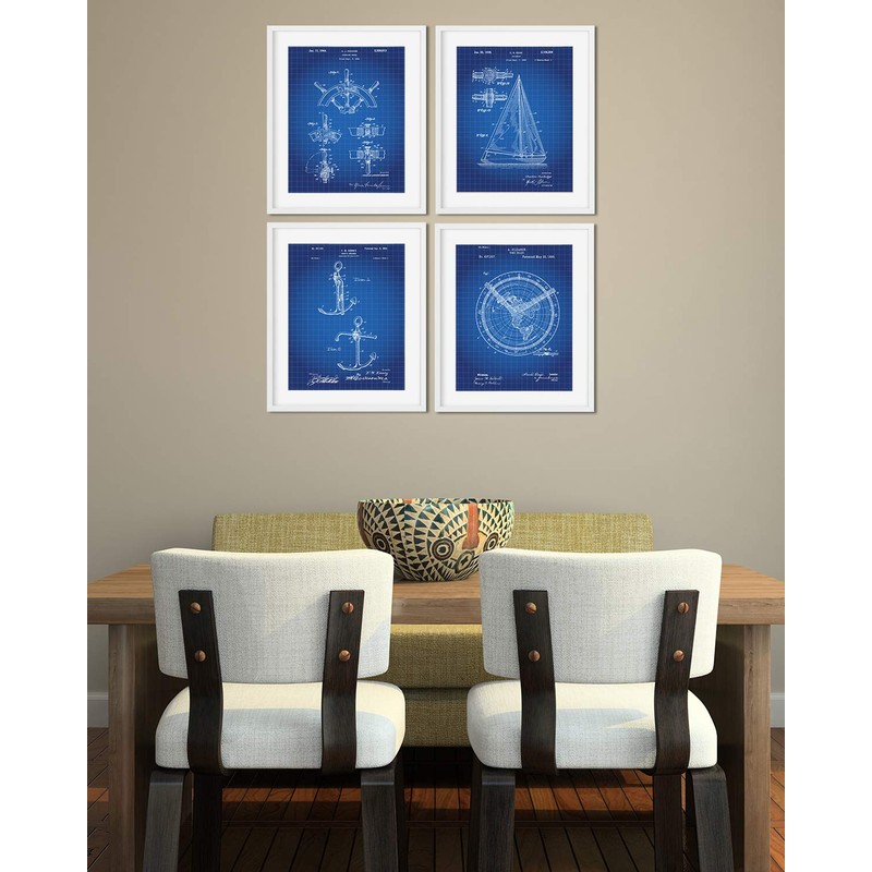 Sailing Patent Wall Art Prints on Blue Grid Background - set of Four (8x10) Unframed - wall art decor for sailors and boat fans