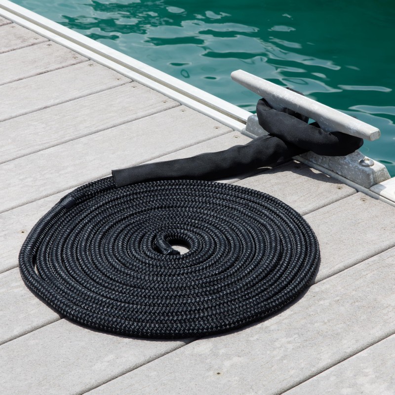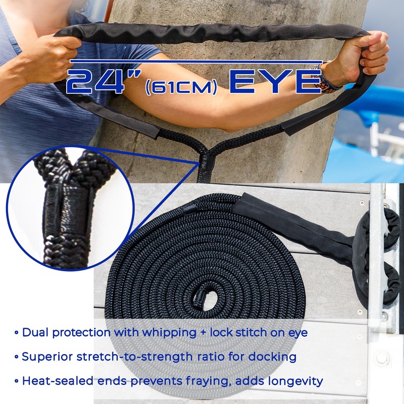 - Secure 24" Pre-Spliced Eye Loop with Chafe Guard: Each dock line features a professionally spliced 24-inch eye loop reinforced with a protective chafe guard sleeve. This key detail enhances wear resistance at the critical connection point, allowing for smooth, reliable tie-offs to cleats, pylons, or dock rings. The snug splice maintains structural integrity without compromising flexibility, reducing the need for knots and keeping your deck clutter-free and secure.
