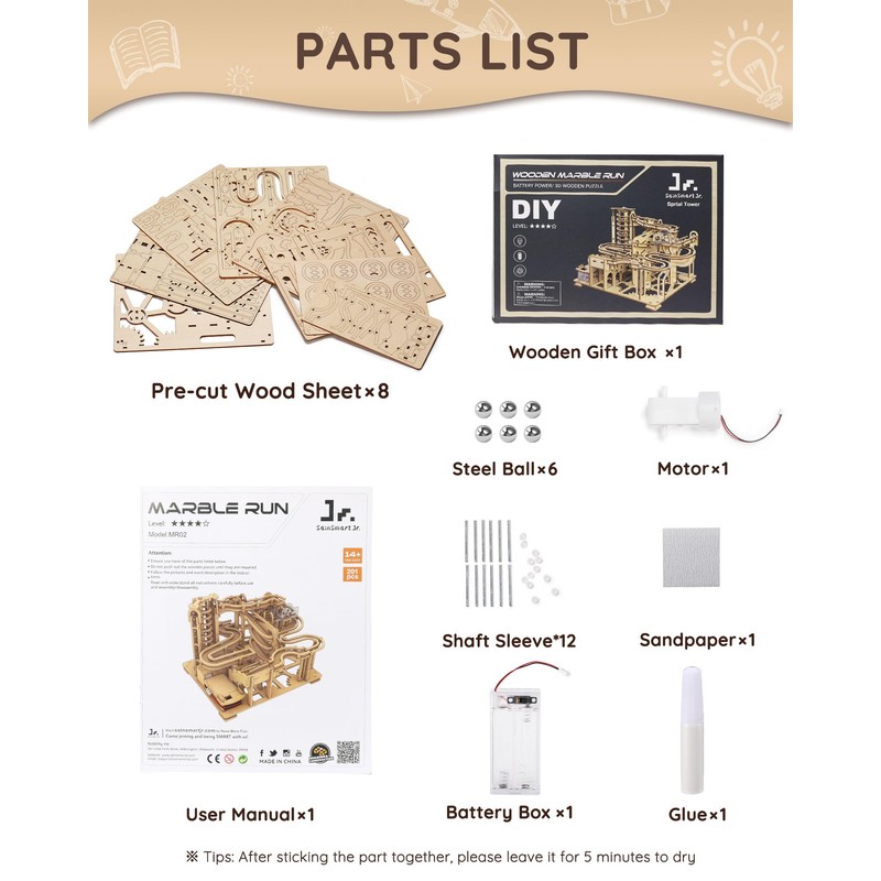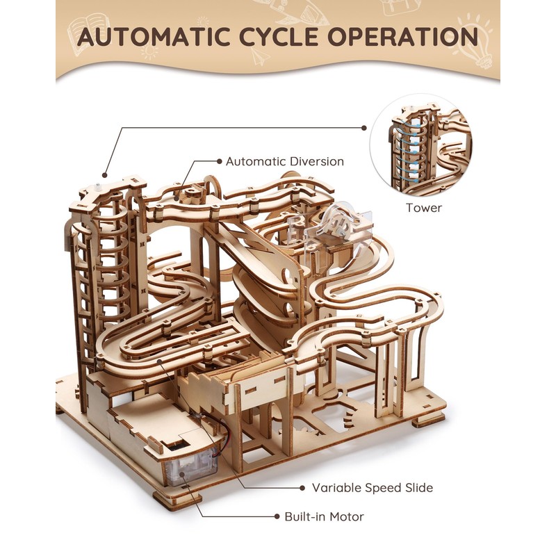- Constructed with 225 pieces and 6 marbles - this 3D puzzle is motor-driven and incredibly cool. Gears propel the marbles to the top, sending them racing through different channels