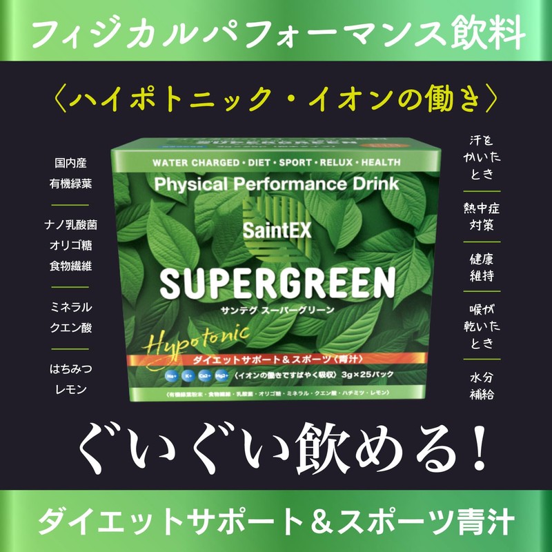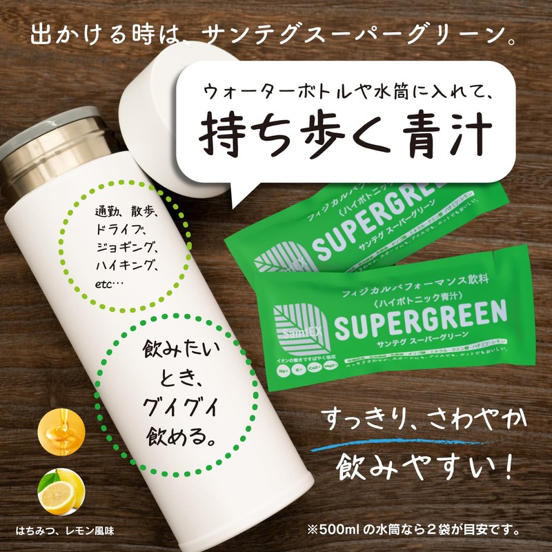 【サンテグスーパーグリーンは、フィジカルパフォーマンス飲料です】サンテグスーパーグリーンは、水分補給や栄養補助を通して、ダイエットサポートとスポーツするからだに役立つ、フィジカルパフォーマンス飲料。あなたの健康をサポートする青汁です。 【サンテグスーパーグリーンは、ハイポトニック飲料です】 ハイポトニック飲料とは、ナトリウムや糖質の濃度が低く、ひとの安静時の体液より浸透圧が低い飲料のこと。運動をして汗が多く出て体液が薄くなっている時でも水分を素速く吸収でき、低糖質・低カロリーのため減量時の飲料に向いている、というメリットがあります。スポーツ時、健康維持のためのダイエット、熱中症対策、脱水症状など、水分補給を必要とするときには、低糖質で浸透圧が低いハイポトニック飲料を! 【サンテグスーパーグリーンは、あなたの健康をサポートします】 サンテグスーパーグリーンの緑成分には、食物繊維やビタミン、ミネラルなどの栄養素が豊富な大麦若葉、ケール、モリンガ、緑茶の国内産有機緑葉粉末を使用しています。低糖質、低カロリーで、毎日の栄養補助に飲んでもヘルシー。食事だけでは不足しがちな野菜不足を補い、健康をサポートします。 【サンテグスーパーグリーンは、好きな時に飲める、すっきり、さわやかな青汁です】 水で溶かして冷蔵庫で冷やしておいてもおいしく召し上がれます。寒い冬にはもちろん、夏の冷房で冷えたときには、ホットがおすすめ!朝昼晩、すきなときにお飲みください。リラックスのティータイムにもぴったり。