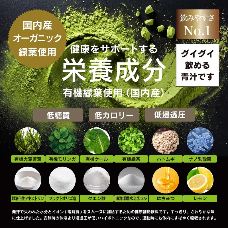 • ダイエットサポート&スポーツ(青汁)飲料。低糖質、低カロリーで、毎日の栄養補助に。