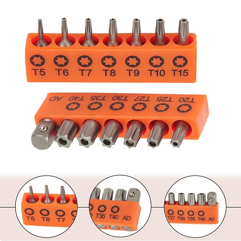- Torx Security Screwdriver Bits: T6, T7, T8, T9, T10, T15, T20, T25, T27, T30, T35, T40 (Each bit has a hole in the center, making it to be tamper resistance)