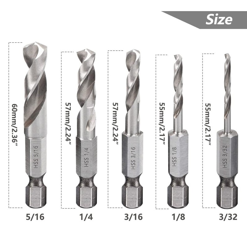 - 5pcs Short Bit Set Sizes: 3/32, 1/8, 3/16, 1/4, 5/16-inch which meet your different drilling requirement. total length: 2.36”/60mm. Easy to use light, compact and sturdy.