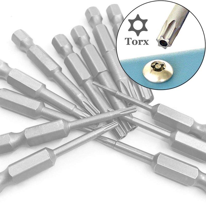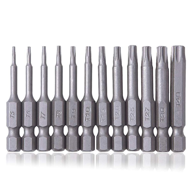 - 12 pieces Torx bits screwdriver set: Sizes: T5, T6, T7, T8, T9, T10, T15, T20, T25, T27, T30, T40. Length: 50 mm, 1/4 inch hexagonal shaft.