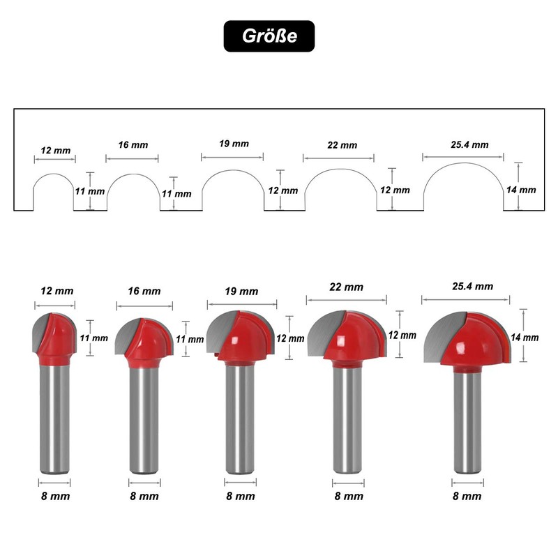 Saipor 5-Piece 8 mm Shank Round Nose Cove Core Box Milling Cutter Carbide Router Bit Hollow Groove Cutter Ball Cutter Woodworking Milling Cutter (Diameter 12/16/19/22/25.4 mm)