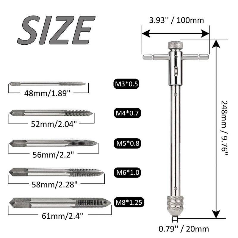 - Tap Wrench Tool Set: The package includes 1pc Adjustable Long T-Handle Ratchet Tap Holder Wrench (248cm/9.76 inch) + 5pcs Mertic Taps (M3*0.5, M4*0.7, M5*0.8, M6*1.0, M8*1.25). T-handle ratcheting tap wrenches provide quick and efficient ratcheting action