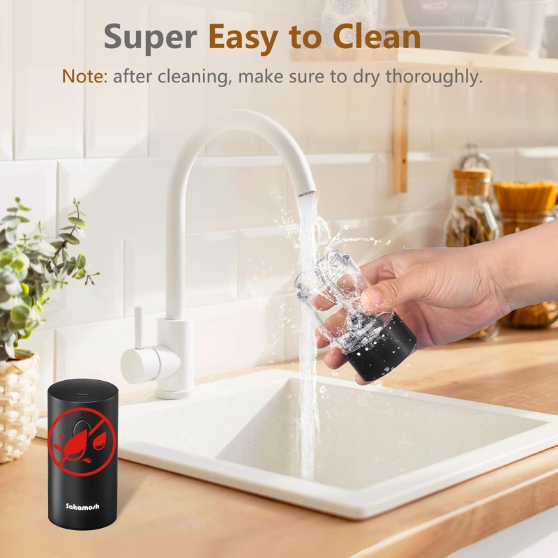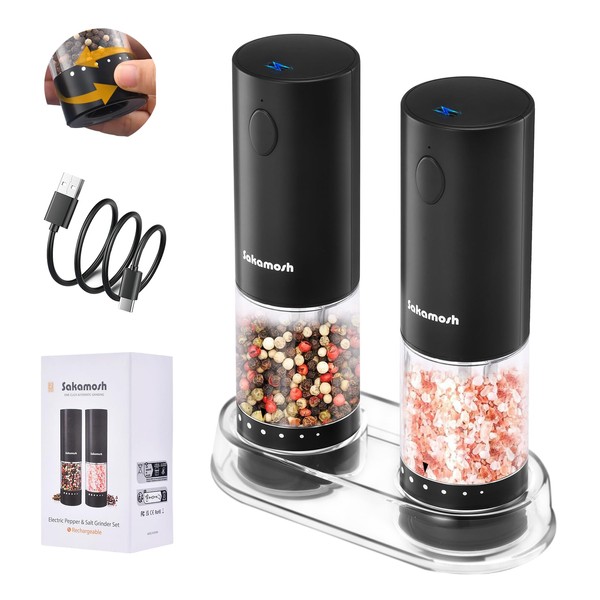 SAKAMOSH Salt and Pepper Shakers Set Electric Black, External Coarseness Adjustment Rechargeable Salt and Pepper Grinder Set with Storage Base, Large Capacity, One Hand Automatic Pepper Mill, 2 Pack