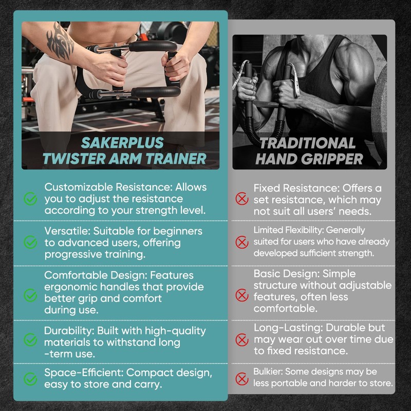 - 【HOME FITNESS EQUIPMENT】SakerPlus twister arm trainer features a unique U-shaped design with 3 resistance options (20-60lb, 40-90lb, 70-110lb), allowing precise muscle stimulation through different grip positions. Ideal for home workouts, it effectively targets the chest, arms, shoulders, back and thigh, helping you build strength like a bodybuilder.
