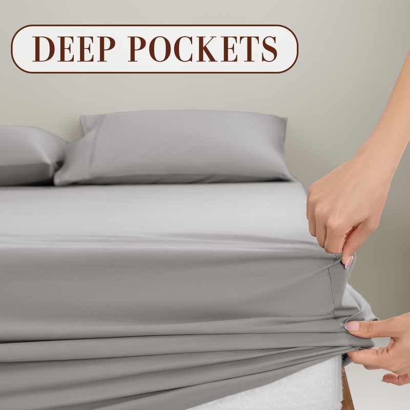 - ELEGANT BEDDING SET WITH DEEP POCKET: Sleep without any worry of bunched up bedding on our snugly fitting bottom sheet. It has a generously sized deep pocket with an all-around elastic. Each luxurious 4 piece King size sheet set which includes 1× Fitted Sheet 78"×80"×16" + 1× Flat Sheet 105"×102"+2× Pillowcases 20"×40".