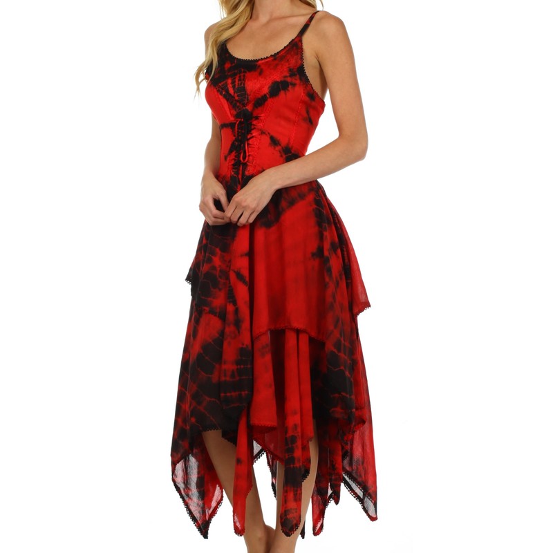 - Unique design features rich tie dye colors, lace up corset style bodice and a full double layer handkerchief hem skirt.