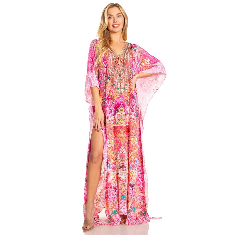 - This caftan dress is very lightweight, and elegant that it can be worn a multiple of different ways. The color combinations are unique. Can be worn as a dress, coverup at the beach, or for parties and nights out during the summertime! One Of A Kind: This garment is crafted in small batches by artisans. Made with the best materials available. Satisfaction Guaranteed : At Sakkas our designing team and collaborators are committed to improve products continuously to bring you quality garments.