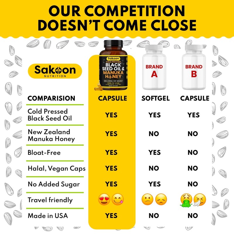 Sakoon nutrition Cold Pressed Black Seed Oil Capsules with Manuka Honey | Vegan Capsule | High Potency 2%+ Thymoquinone | Made in USA | 60 Count