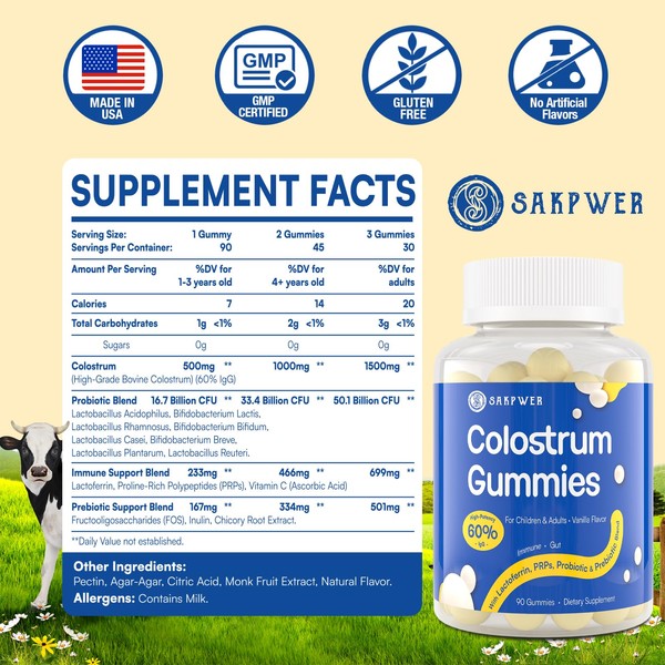 Sakpwer Bovine Colostrum Supplement Gummies - with 60% Highest IgG, Lactoferrin, Probiotics and Prebiotics for Adults and Kids, Vanilla Flavor & Sugar Free, 2 Pack